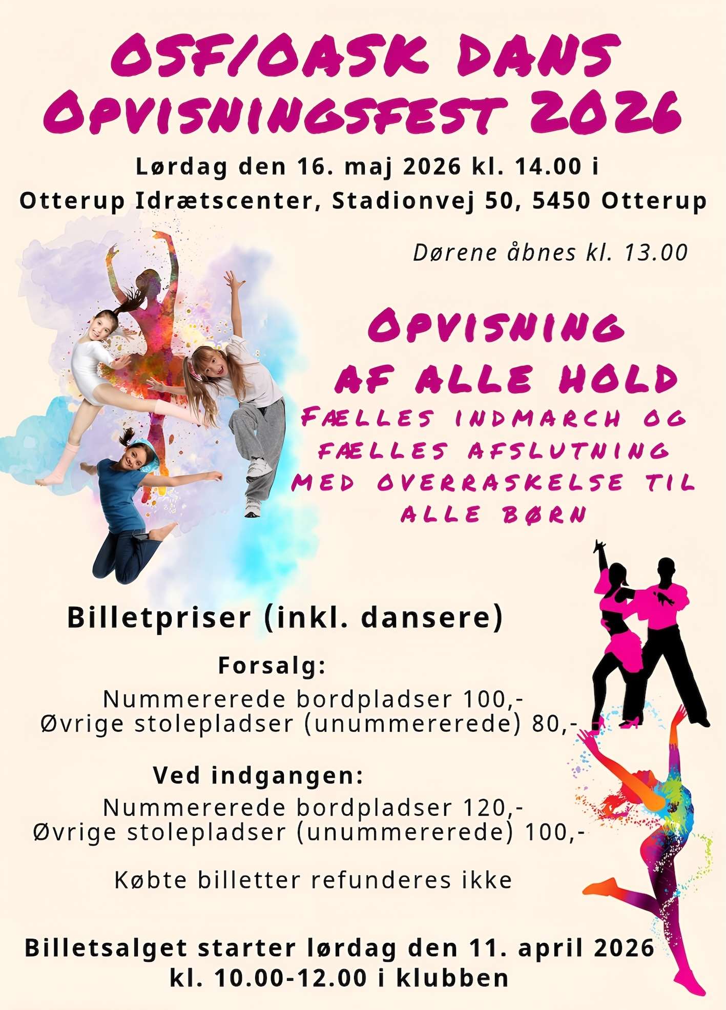 Er du forhindret i at møde op fysisk den 11. april, kan der fra denne dag sendes en mail til mail@osf-dans.dk med bestilling af bordpladser. Disse vil blive ekspederet efter at billetsalget slutter kl. 12.00 i den rækkefølge de modtages.